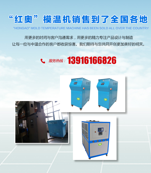 公司旗下?lián)碛屑t奧品牌模溫機,公司設立有研發(fā)部,銷售部,制造部,售后服務部,公司主要產(chǎn)品由:油溫機、水溫機,非標定制模溫機,冷水機,冰水機、點冷機、冷熱一體機,導熱油加熱器、電加熱導熱油爐及溫度控制系統(tǒng)的定制和改造升級。產(chǎn)品涵蓋了壓鑄,注塑,吹塑,擠出生產(chǎn)線,高分子成型,工業(yè)干燥,薄膜加工,金屬板制造,印刷,食品,醫(yī)療,反應釜等行業(yè)。十多年來,在全體同仁的不懈努力下,“紅奧”模溫機銷售到了全國各地,得到了廣大客戶和社會各界的認可與支持...